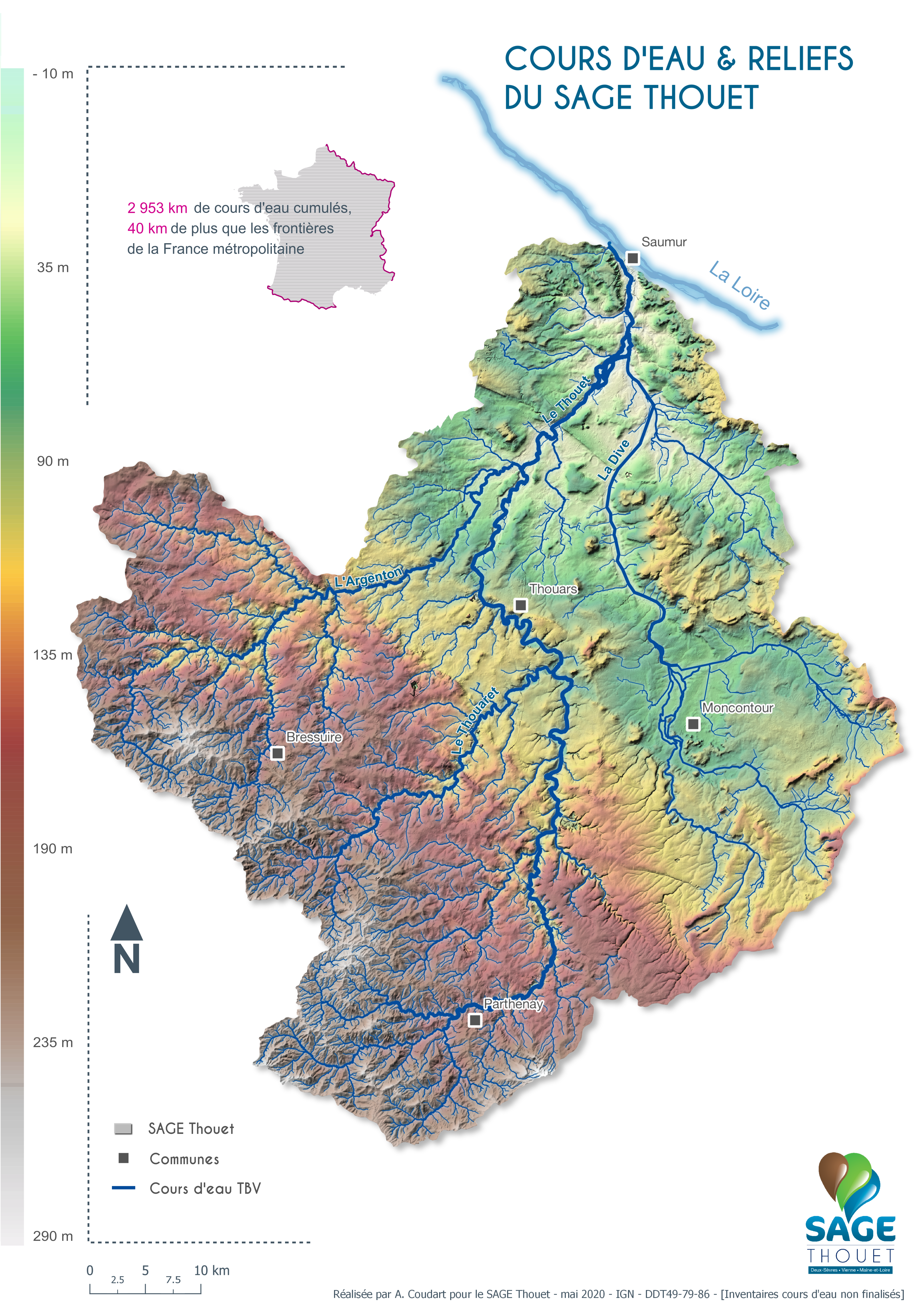 Mise en avant de la dualité des formes de relief sur le territoire d'étude, mise en perspective des linéaires des cours d'eau étudiés avec référence démonstrative. Usage institution et communication.
