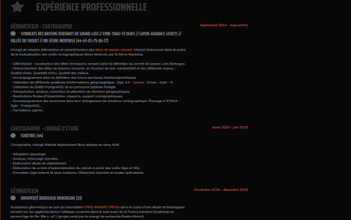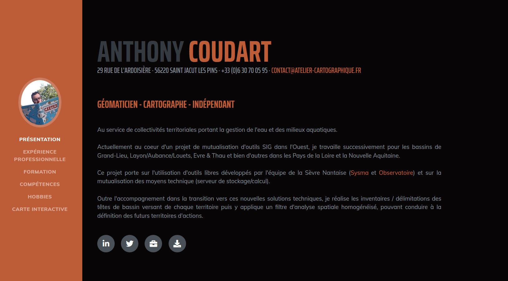 Librement adapté d'un template bootstrap, le cv détaille tous les chapitres classiques de l'exercice en illustrant mes compétences en HTML, CSS et administration web basique. Réalisation d'une carte dynamique leaflet reliée à une base PostgreSQL via php et animée avec javascript et jquery. Accéder au site